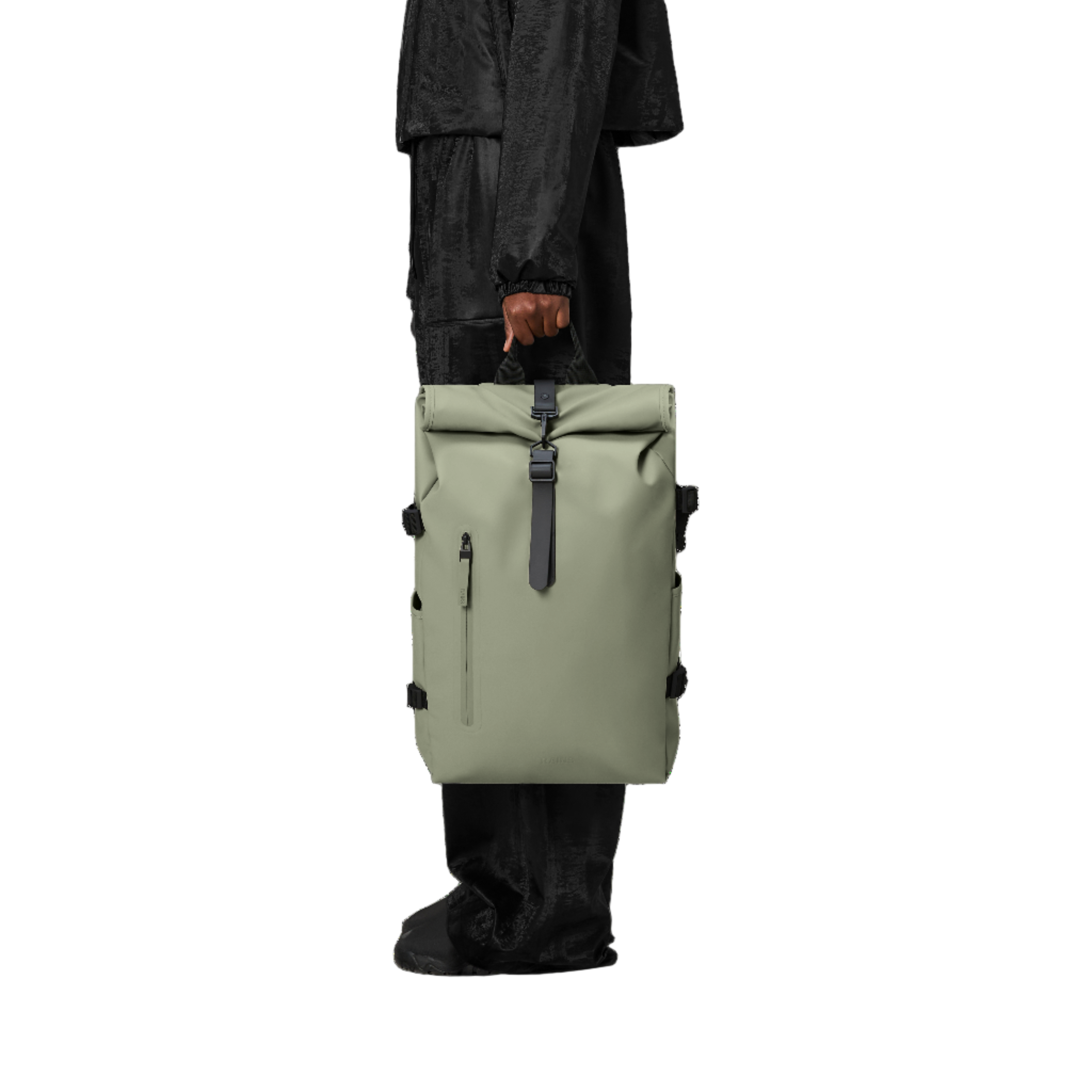 Rains' most iconic Rolltop Rucksack revised with larger proportions and additional functionality, including two side pockets.