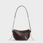 Minoh is the mini half-moon bag with a contemporary design. Crafted in dark brown leather with top-zip closure, an adjustable shoulder strap and decorative metal trimmings. Details include decorative stitching and a small interior pocket.