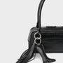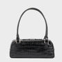 The small bag Nomi Mini is our contemporary take on the classic bowling bag. The style is crafted from black leather with a crocodile print. The design features piping around the edges.